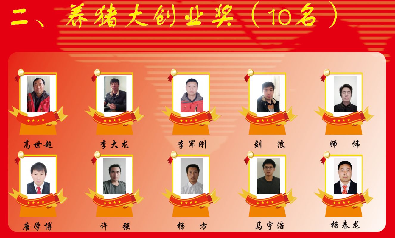 咸陽正能養(yǎng)殖公司: 劉 體 “養(yǎng)豬大創(chuàng)業(yè)獎” 10名 榆林正輝養(yǎng)殖有限公司 李軍剛 隴東事業(yè)部服務(wù)專員 唐學(xué)博 寶雞坪頭豬場 楊 方 商洛柞水豬場 李大龍 咸陽渭濱豬場 高世超 咸陽事業(yè)部技術(shù)服務(wù) 許強(qiáng) 劉浪