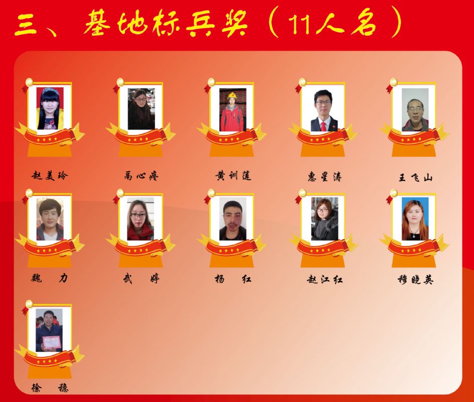 渭南事業(yè)部技術(shù)服務(wù) 馬宇浩 師偉 楊春龍 “基地標(biāo)兵獎“ 11名 甘肅事業(yè)部武威基地2人:穆曉英 王飛山 山西事業(yè)部新絳基地2人:武 婷 楊 紅 高陵基地6人: 趙江紅 鬲心疼 黃訓(xùn)蓮 魏力 徐穩(wěn) 惠星濤 山東營銷公司1人: 趙美玲 “服務(wù)大轉(zhuǎn)型獎”17名 西安事業(yè)部:徐衛(wèi)霖 王發(fā)科 甘肅事業(yè)部:岳志均 趙海濤 蔡天慶 咸陽事業(yè)部:梁友 何增喜 渭南事業(yè)部:蘇善輝 雷川文 韓軍亮 山西事業(yè)部:吳慶東 劉; 岳鵬龍 馬鴻飛 隴東事業(yè)部:李澤華 何三娃 隴南事業(yè)部:王世偉 “英雄團(tuán)隊(duì)獎”13支 青海養(yǎng)殖服務(wù)公司 渭東養(yǎng)殖服務(wù)公司 渭北養(yǎng)殖服務(wù)公司 榆林西養(yǎng)殖服務(wù)公司 涇三高養(yǎng)殖服務(wù)公司 禮乾養(yǎng)殖服務(wù)公司 安康東養(yǎng)殖服務(wù)公司 西安大客戶養(yǎng)殖服務(wù)公司 靜寧養(yǎng)殖服務(wù)公司 高陵基地生產(chǎn)部 武威養(yǎng)殖服務(wù)公司 稷山養(yǎng)殖服務(wù)公司 臨汾養(yǎng)殖服務(wù)公司
