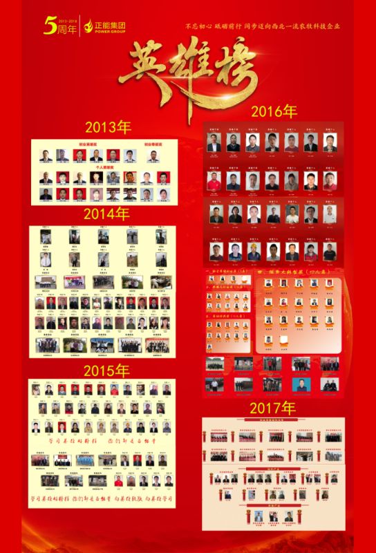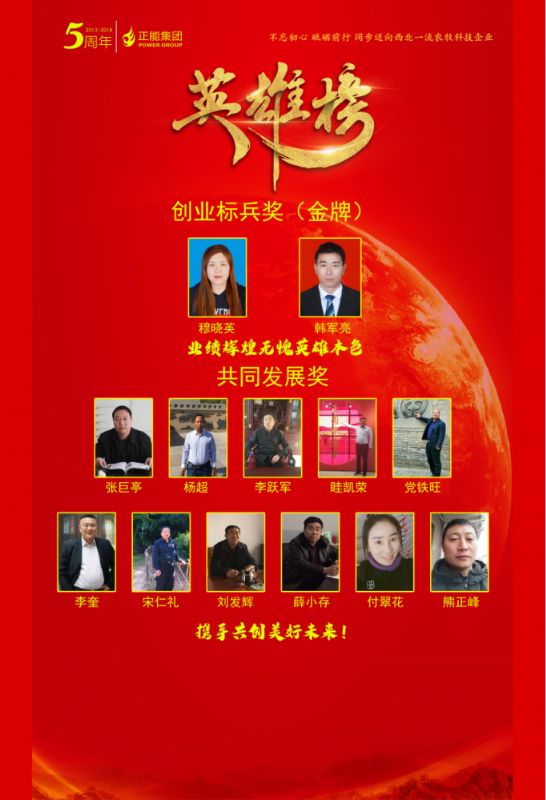 聯(lián)合發(fā)展獎(jiǎng)-優(yōu)秀供應(yīng)商 獎(jiǎng)牌木托+水晶獎(jiǎng)杯 西安邦淇制油科技有限公司 益海嘉里興平食品工業(yè)有限公司 三原三森膨化飼料有限公司 陜西寧興泰商貿(mào)有限公司 西安裕豐牧業(yè)有限責(zé)任公司 創(chuàng)業(yè)標(biāo)兵獎(jiǎng) 16 銀牌 8 咸興武養(yǎng)殖服務(wù)公司 陳樂樂 漢中養(yǎng)殖服務(wù)公司 徐衛(wèi)霖 渭北養(yǎng)殖服務(wù)公司 雷川文 濟(jì)源養(yǎng)殖服務(wù)公司 楊文軍 稷山養(yǎng)殖服務(wù)公司 劉; 隴東事業(yè)部 何三娃 山東事業(yè)部 蔣 成 秦東事業(yè)部 蘇善輝 創(chuàng)業(yè)標(biāo)兵獎(jiǎng) 8 養(yǎng)豬事業(yè)部 合同豬放養(yǎng)部技術(shù)經(jīng)理 楊春龍 養(yǎng)豬事業(yè)部 九龍?jiān)簇i場(chǎng)廠長 任林沖 高陵基地品管部經(jīng)理 惠星濤 高陵基地生產(chǎn)部經(jīng)理 雷永軍 高陵基地采購部經(jīng)理 史芝平 高陵基地財(cái)務(wù)部經(jīng)理 王 敏 新絳生產(chǎn)基地 銷管 李玉蓮 高陵基地 銷售主管 鬲心疼 創(chuàng)業(yè)標(biāo)兵獎(jiǎng)(金牌) 養(yǎng)豬事業(yè)部 供銷部總監(jiān) 韓軍亮老師 武威生產(chǎn)基地 銷 管 穆曉英老師 創(chuàng)業(yè)英雄獎(jiǎng)(10人) 銀牌 榮獲正能集團(tuán)五周年 “創(chuàng)業(yè)英雄獎(jiǎng)”的創(chuàng)業(yè)英雄干部共10人 隴東事業(yè)部 總經(jīng)理 李 勇 陜南事業(yè)部 總經(jīng)理 董 雄 河西事業(yè)部 總經(jīng)理 蔡祖寬 河?xùn)|事業(yè)部 總經(jīng)理 陳小華 秦西事業(yè)部大客戶部 總經(jīng)理 張博社 秦西事業(yè)部禮乾養(yǎng)殖服務(wù)公司 總經(jīng)理 翟轉(zhuǎn)鎖 新豐泰事業(yè)部新甘隴 總經(jīng)理 田 琦 晉北事業(yè)部晉中養(yǎng)殖服務(wù)公司 總經(jīng)理 吳慶東 晉南事業(yè)部運(yùn)城養(yǎng)殖服務(wù)公司 總經(jīng)理 周彥軍 陜北事業(yè)部大客戶部 總經(jīng)理 何國華 創(chuàng)業(yè)功勛獎(jiǎng) (3人) 銀牌 集團(tuán)副總裁、秦西事業(yè)部總經(jīng)理 屠茂堂老師 養(yǎng)豬產(chǎn)業(yè)總裁 李高峰老師 集團(tuán)副總裁、產(chǎn)品技術(shù)研發(fā)總監(jiān) 連星老師