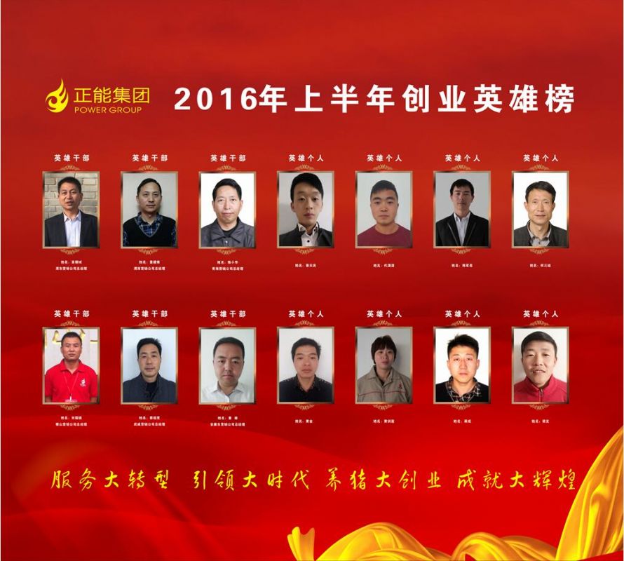 2016年7月19日晚19:00-21:00,“正能集團(tuán)股權(quán)轉(zhuǎn)讓儀式暨2016年上半年創(chuàng)業(yè)英雄頒獎(jiǎng)晚會(huì)”在西北革命圣地-銅川照金隆重舉行。今夜的照金賓館五樓會(huì)議廳華燈璀璨、高朋滿座,正能集團(tuán)總裁王義輝、集團(tuán)產(chǎn)品技術(shù)總監(jiān)連星、財(cái)務(wù)總監(jiān)朱武寧、高陵基地總經(jīng)理白萬禮、渭南、西安、咸陽、甘肅、山西、隴東等事業(yè)部、營銷公司總經(jīng)理出席晚會(huì)。正能創(chuàng)業(yè)英雄戰(zhàn)將共計(jì)100余人參加本次晚會(huì)。本次大會(huì)以“服務(wù)大轉(zhuǎn)型、引領(lǐng)大時(shí)代、養(yǎng)豬大創(chuàng)業(yè)、成就大輝煌”為主題,以開闊的視野、創(chuàng)新的形勢,引爆巨大能量場,聚英雄氣概,展團(tuán)隊(duì)風(fēng)采,亮大帥風(fēng)姿,迸發(fā)激情,總結(jié)2016上半年輝煌成就,斗志昂揚(yáng),展望2016下半年宏偉藍(lán)圖。 獎(jiǎng)項(xiàng)設(shè)置:英雄個(gè)人:100G純銀打造的正能英雄獎(jiǎng)?wù)?共22人。 英雄干部:100G純銀打造的正能英雄獎(jiǎng)?wù)?共6人。